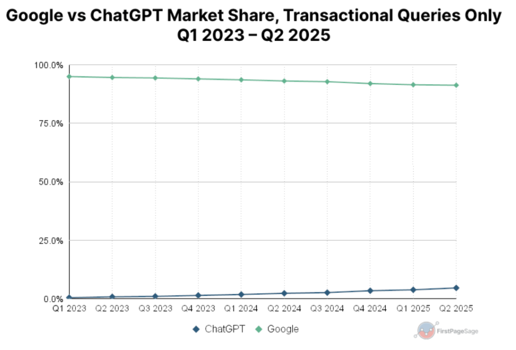 Att Google tappar marknadsandelar vet de flesta, men frågan är hur mycket. Enligt data från First Page Sage växte ChatGPT kontinuerligt gentemot Google mellan Q1 2023 och Q2 2025.